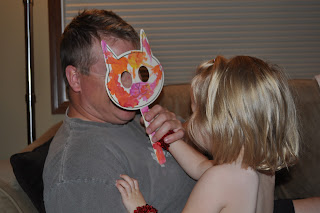 I just thought this was funny. Paige was running around the house last night wearing little red bracelets and sporting the kitty cat mask she painted earlier in the day. She thought she was so funny, she kept wanting Ryan and I to try the mask on too.